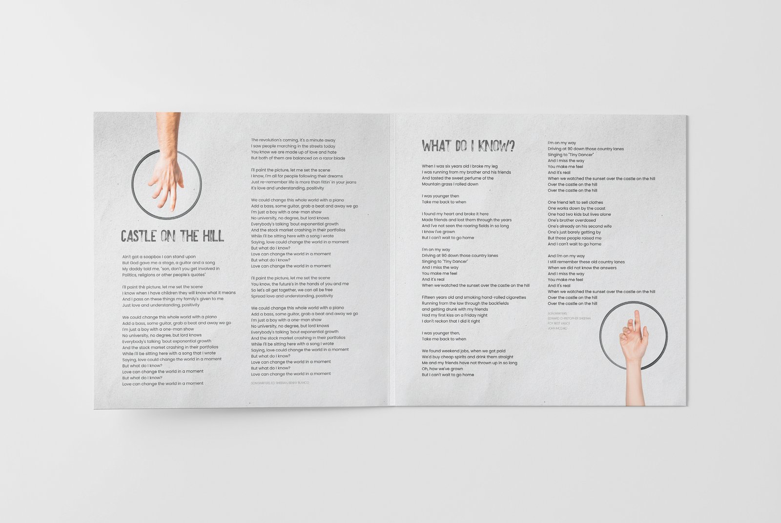 This project reimagines the visual identity of Ed Sheeran’s Divide album, creating a design that is both delicate and deeply expressive. It captures the emotions within the music, translating them into a visual language that feels raw and intimate. The design focuses on the essence of the album, bringing its feelings to life with photography and typography.