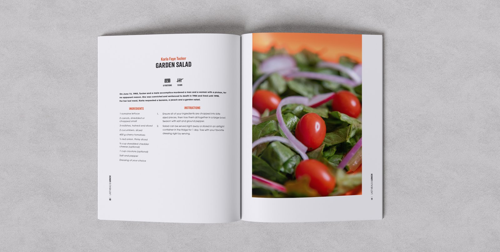 Last Meals is a cookbook exploring the final meal requests of inmates facing execution. Through 10 recipes, you’ll discover personal tastes and cultural backgrounds, offering a glimpse into the human experience within the justice system. This project approaches the complex subject with respect, focusing on the universal language of food and the stories it tells. As both a culinary and editorial project, I photographed all the dishes and designed the layout, giving voice to this unique project.